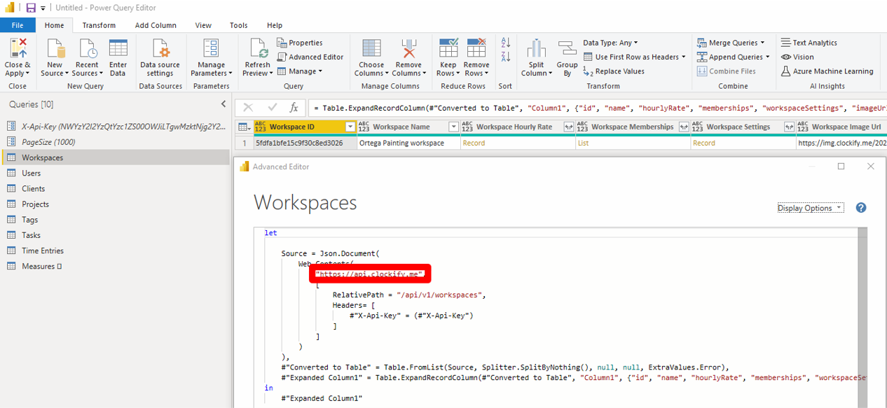 Self-hosted Clockify users, you will need to open the template and go through every query and in the advanced editor and change the URL to your server connection detail where you have Clockify installed, it is the same URL that you use to log in.